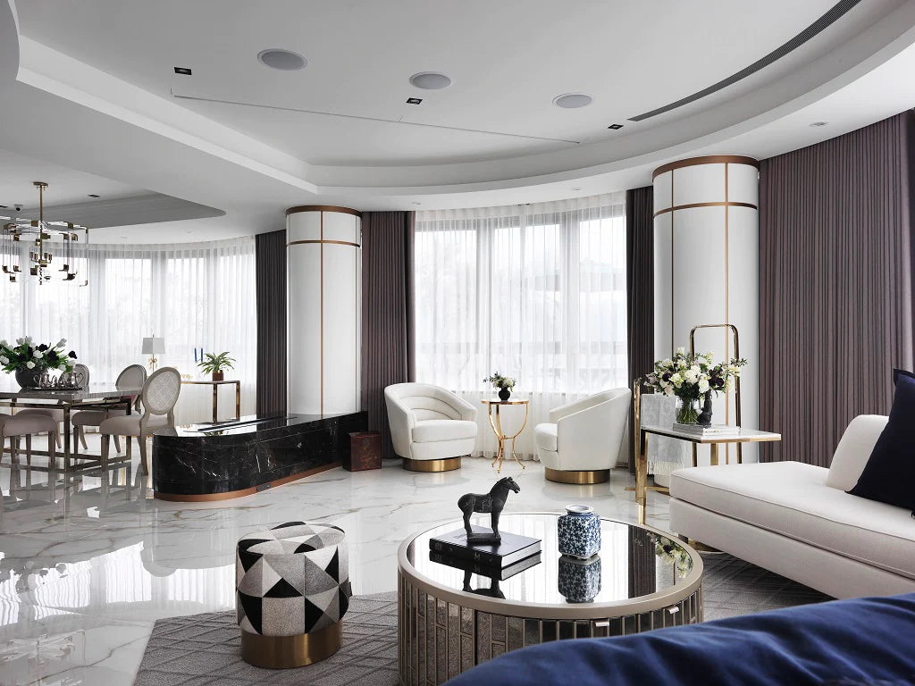 屋主夫妻設計喜好不同,女主人愛巴洛克華麗,男主人喜現代東方。最佳解決方案是以現代古典混搭的Art Deco風格,結合直線與幾何表現,展現簡潔內斂的現代東方,金屬和鏡面材質增添華麗感,完美融合古典、東方與西方元素!